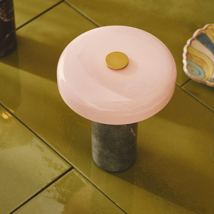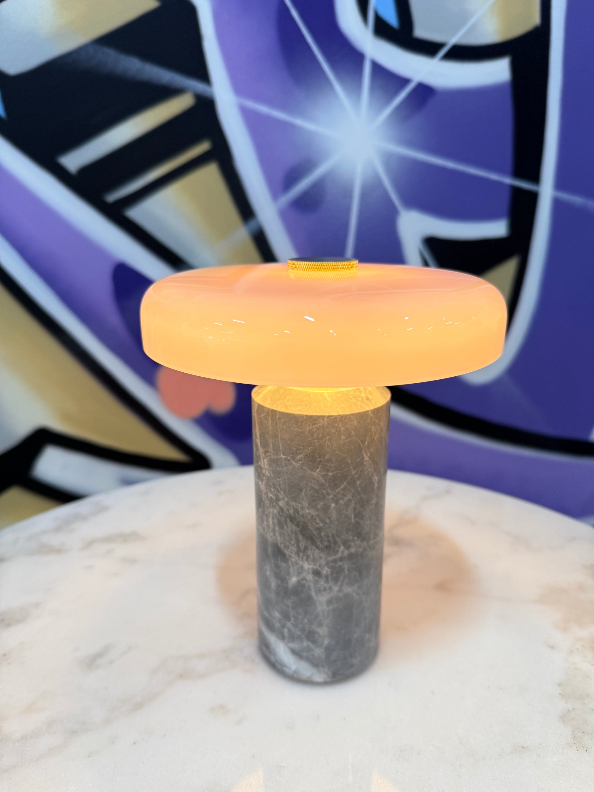 TRIP ist eine elegante, tragbare und wiederaufladbare Lampe von Design von uns Diese Lampe vereint Form und Funktion in einem kabellosen Design. Mit ihrem massiven Marmorsockel und dem mundgeblasenen Glasschirm verleiht sie jedem Raum eine elegante Note und fügt sich gleichermaßen harmonisch in moderne wie klassische Umgebungen ein. Bis zu 14 Stunden Akkulaufzeit bei maximaler Helligkeit.