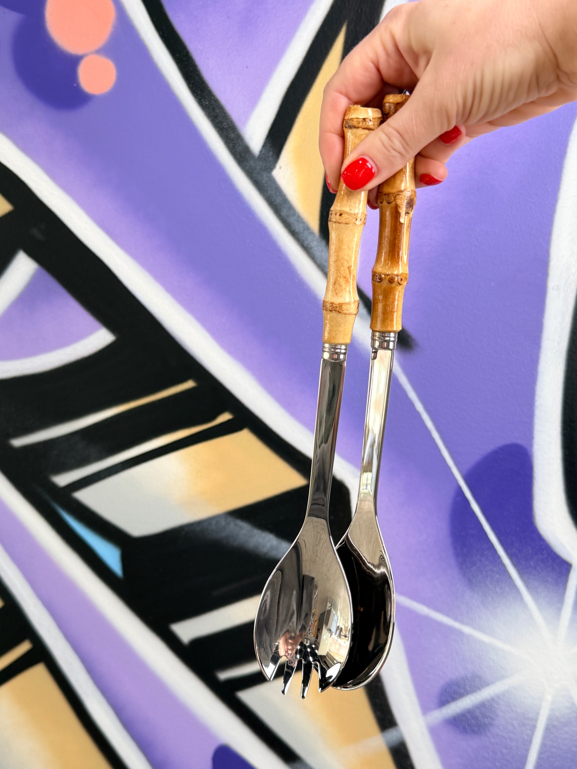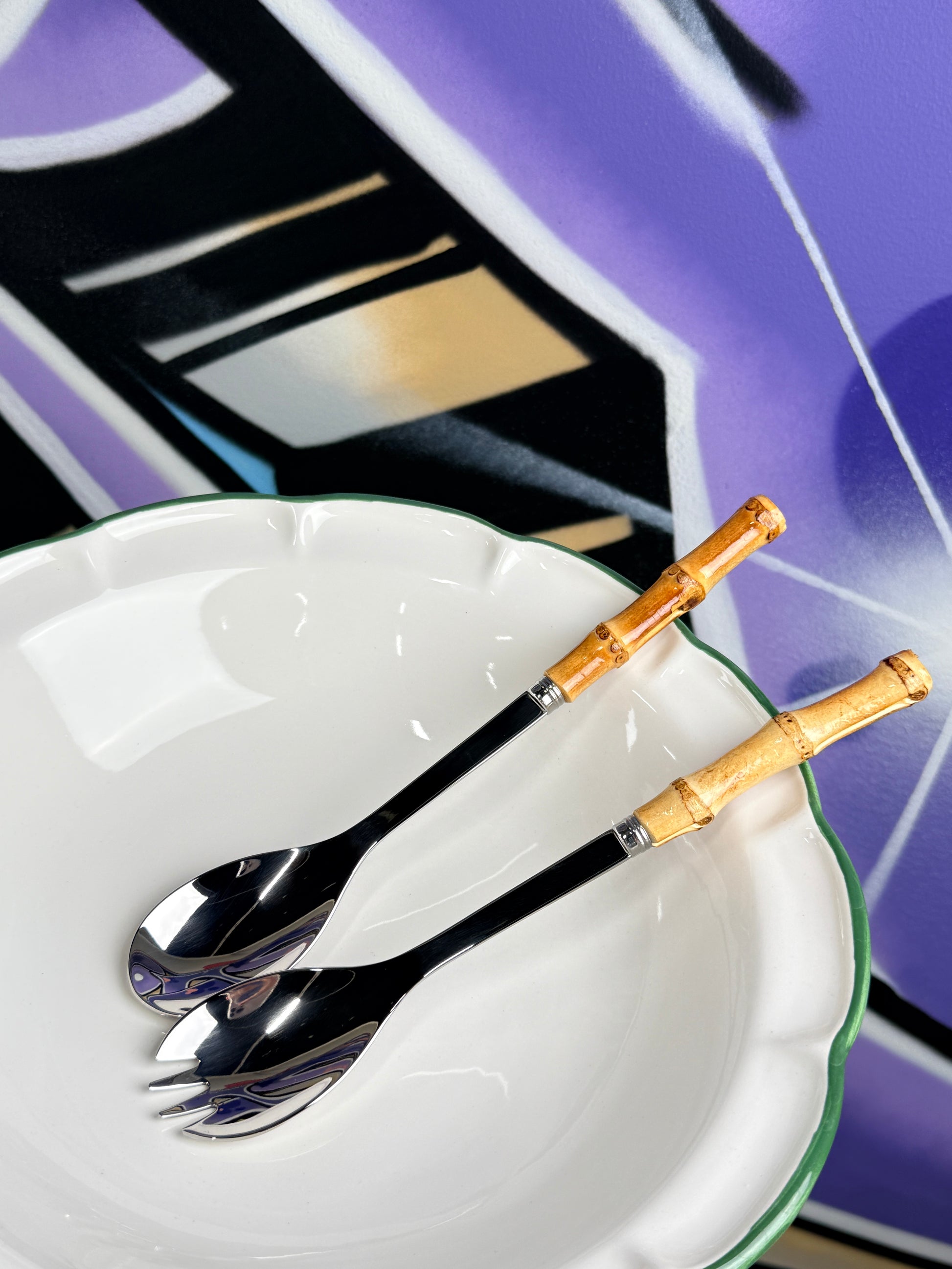 The handles made of real bamboo are durable but natural. To preserve the luster of the wood, regular care with olive oil or linseed oil is recommended. Do not let the salad cutlery soak and avoid prolonged contact with strongly colored foods.