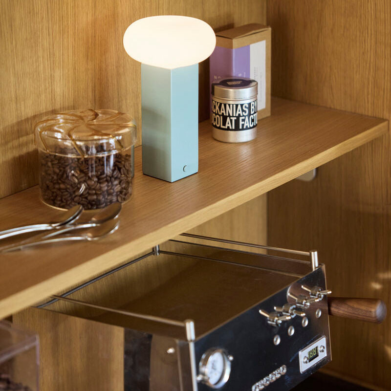 Low on kannettava valaisin, jossa on opaalilasivarjostin ja vaaleansininen teräsjalusta. Kompaktin muotonsa ansiosta se on helppo sijoittaa yöpöydälle, ruokapöydälle, hyllylle tai lukunurkkaukseen.