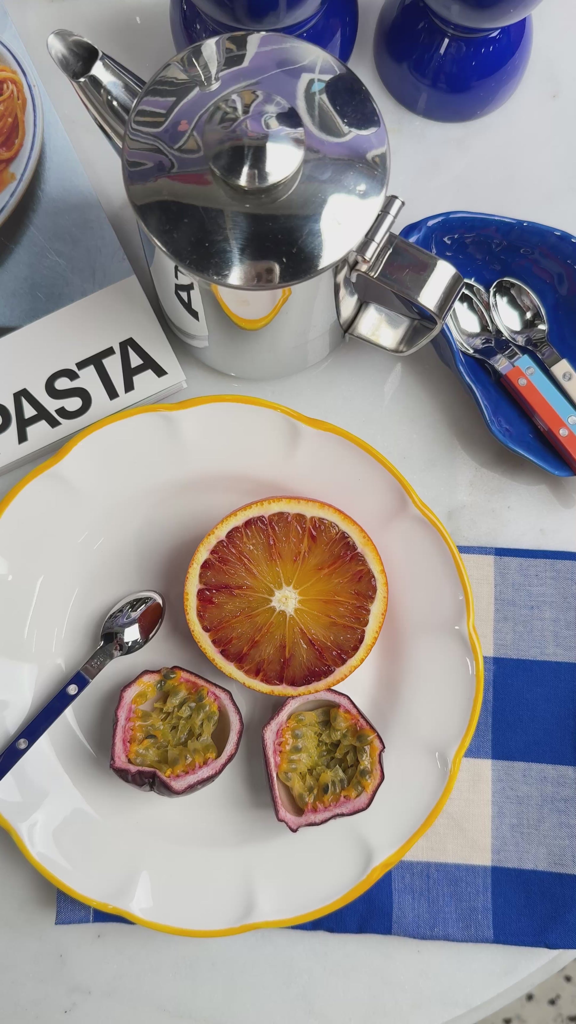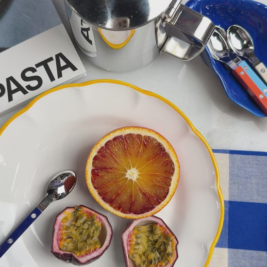 Chaque pièce est fabriquée et peinte à la main en Italie, ce qui confère à la porcelaine un charme unique. De légères variations de glaçure, de couleur et de finition rendent chaque pièce unique. La porcelaine est blanche, mais sa surface vibrante, parsemée de petits points et de nuances naturelles, lui apporte chaleur et caractère.