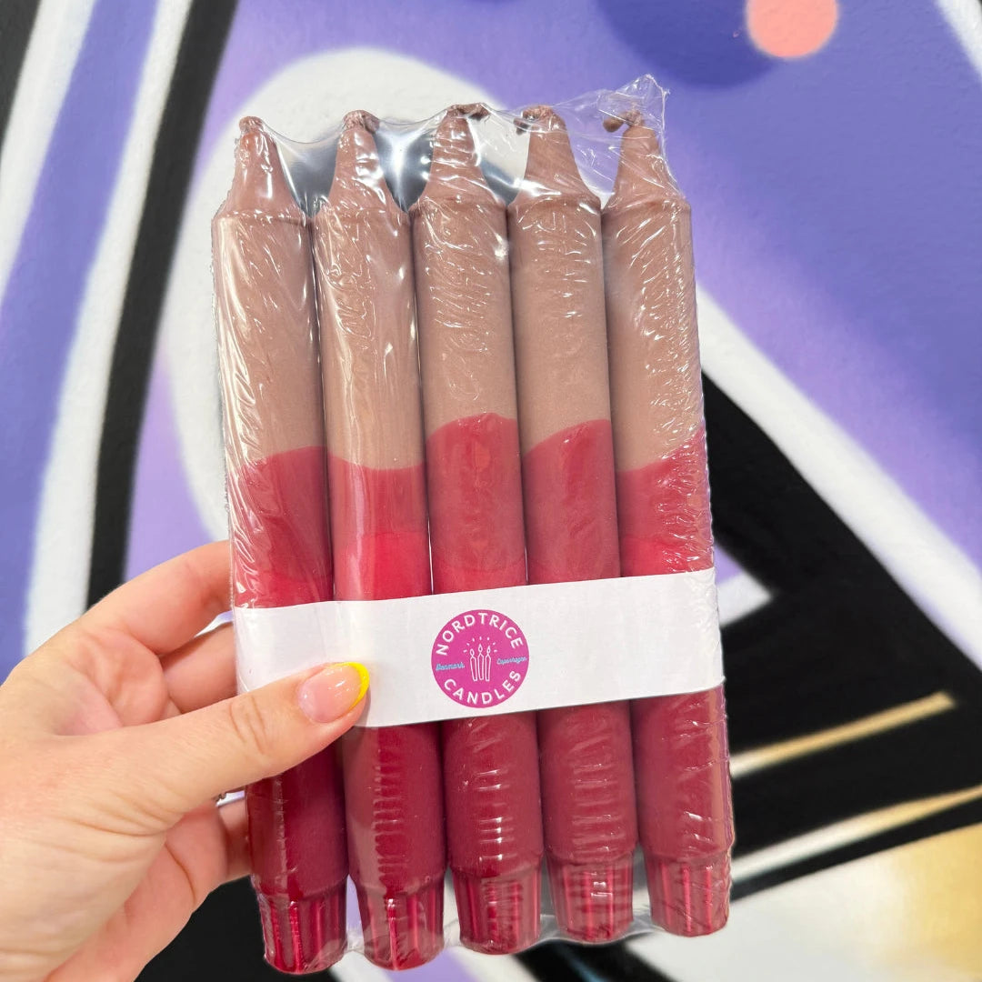 Håndlagde lys i toner av beige, korall og rødt – dyppet og dekorert for hånd i Nordtrice Candles studio i København.