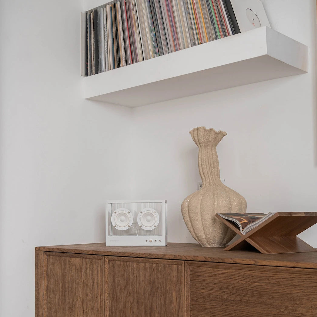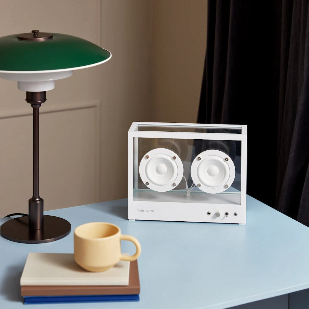 Gjennomsiktig høyttaler i størrelse small fra det svenske selskapet Gjennomsiktig lyd er en stilig og kraftig høyttaler i herdet glass og aluminium, skapt for å gi like mye designglede som fantastisk lydkvalitet. Med sitt rene, transparente designspråk glir den inn i ethvert miljø – og løfter både interiøret og musikken.