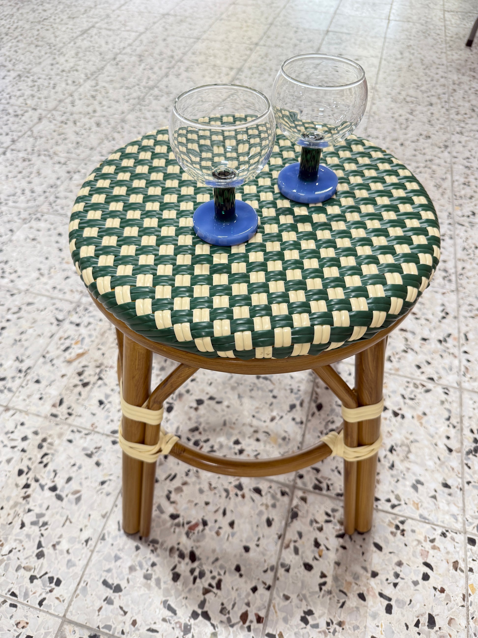 Ta hem den klassiska Paris-känslan med Tabouret Bas La Closerie. En låg bistropall i grönt & beige som för tankarna till franska caféer och terrasser. Perfekt som extra sittplats, sidobord eller dekorativ detalj i hemmet.