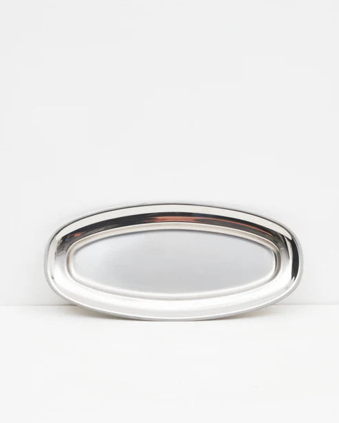 En elegant oval serveringsbricka i klassisk form som används på Osteria 16 i Köpenhamn, där enkelhet och genuin italiensk matlagning står i centrum. Tillverkad i Italien av blankpolerat rostfritt stål, perfekt för både vardag och fest.